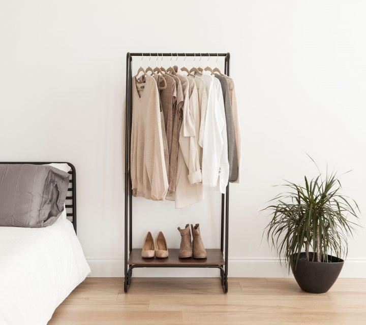 "一个简约风格的卧室角落,黑色金属衣架上挂着多件米色和白色的衣物,下方架子放着两双浅色鞋子,旁边是一盆绿植,左侧可见一张铺有白色床单和灰色枕头的床。",