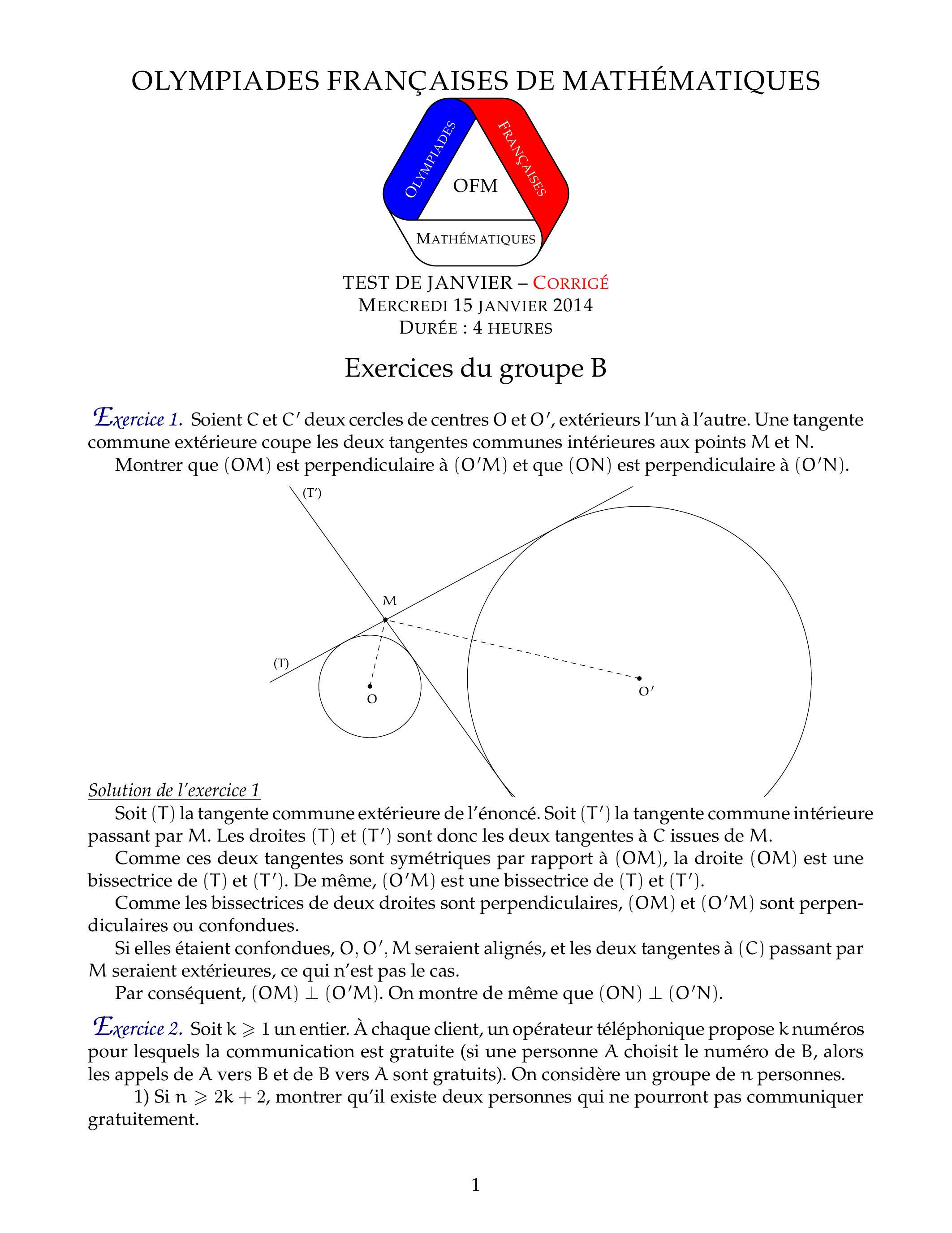 Par conséquent, $(O M) \perp\left(O^{\prime} M\right)$. On montre de même que $(O N) \perp\left(O^{\prime} N\right)$. Exercice 2. Soit $k \geqslant 1$ un entier. À chaque client, un opérateur téléphonique propose $k$ numéros pour lesquels la communication est gratuite (si une personne $A$ choisit le numéro de $B$, alors les appels de $A$ vers $B$ et de $B$ vers $A$ sont gratuits). On considère un groupe de $n$ personnes.