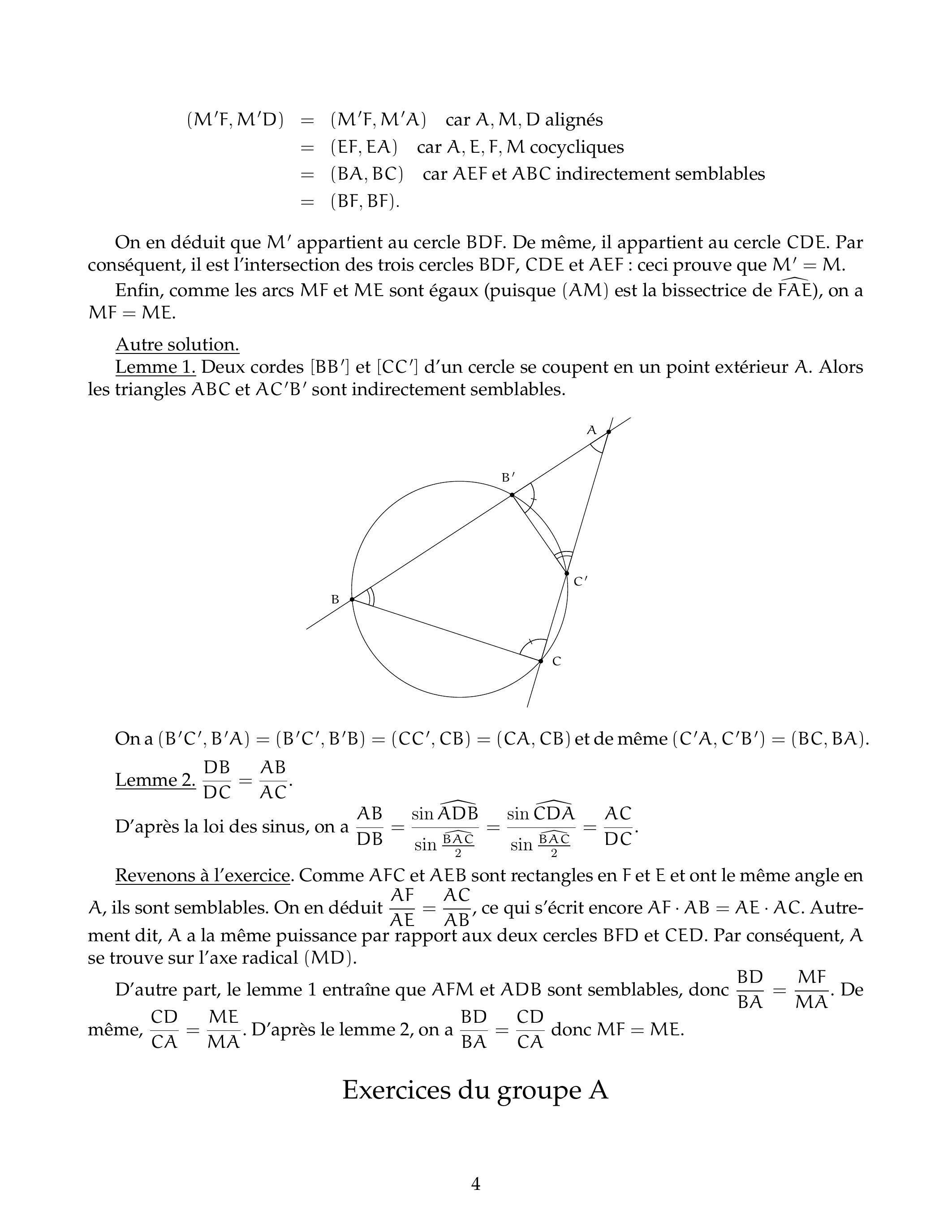 On a $\left(B^{\prime} C^{\prime}, B^{\prime} A\right)=\left(B^{\prime} C^{\prime}, B^{\prime} B\right)=\left(C C^{\prime}, C B\right)=(C A, C B)$ et de même $\left(C^{\prime} A, C^{\prime} B^{\prime}\right)=(B C, B A)$. Lemme 2. $\frac{D B}{D C}=\frac{A B}{A C}$. D'après la loi des sinus, on a $\frac{A B}{D B}=\frac{\sin \widehat{A D B}}{\sin \frac{\widehat{B A C}}{2}}=\frac{\sin \widehat{C D A}}{\sin \frac{\widehat{B A C}}{2}}=\frac{A C}{D C}$. Revenons à l'exercice. Comme AFC et AEB sont rectangles en $F$ et $E$ et ont le même angle en $A$, ils sont semblables. On en déduit $\frac{A F}{A E}=\frac{A C}{A B}$, ce qui s'écrit encore $A F \cdot A B=A E \cdot A C$. Autrement dit, $A$ a la même puissance par rapport aux deux cercles BFD et CED. Par conséquent, $A$ se trouve sur l'axe radical (MD). $D^{\prime}$ 'autre part, le lemme 1 entraîne que $A F M$ et $A D B$ sont semblables, donc $\frac{B D}{B A}=\frac{M F}{M A}$. De même, $\frac{C D}{C A}=\frac{M E}{M A}$. D'après le lemme 2 , on a $\frac{B D}{B A}=\frac{C D}{C A}$ donc $M F=M E$.